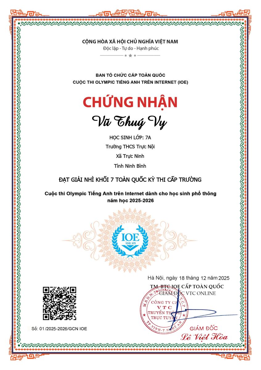 Trong phong trào thi đua học tập sôi nổi của năm học 2025 – 2026, Trường THCS Trực Nội tuyên dương và chúc mừng các em học sinh đã đạt thành tích xuất sắc trong Kỳ thi Olympic tiếng Anh trên Internet (IOE) cấp trường, với kết quả được xếp hạng trên phạm vi toàn tỉnh Ninh Bình và toàn quốc.